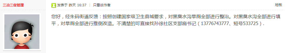 三治三促管理:您好,经朱码街道反馈:按照创建国家级卫生县城要求,对黑臭水沟旱厕全部进行整治。对黑臭水沟全部进行填平,对旱厕全部进行推倒改造。不清楚的可直接找孙徐社区支部施书记(13776743777、短号533725).