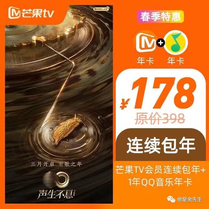 活动3:【芒果TV连包年卡】加赠QQ音乐豪华年卡=178,低至0.48/天