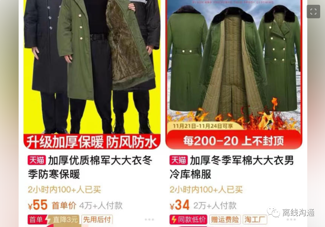 在各大网购平台上,军大衣的销售情况都相当亮眼。双十一期间,基于军大衣设计的棉服销售额同比激增181%。特别是在淘宝上,有两家店铺在两小时内销售了超过100件军大衣,付款人数达数万。单单淘宝平台,购买军大衣的人数就超过了10万。