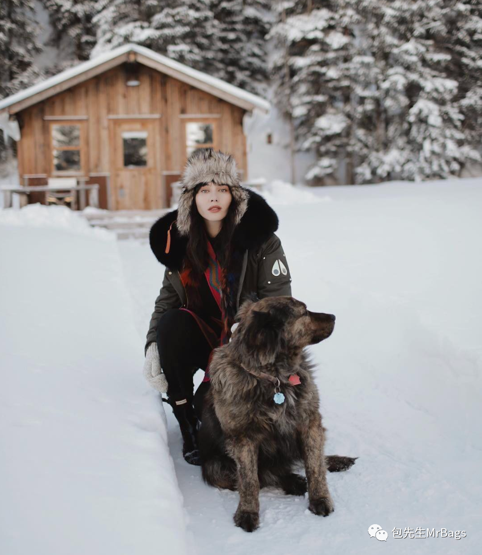 她穿着Moose Knuckles最经典的军绿色短款夹克3Q,搭配白色毛毛领,干净大方,又完全不臃肿老气。