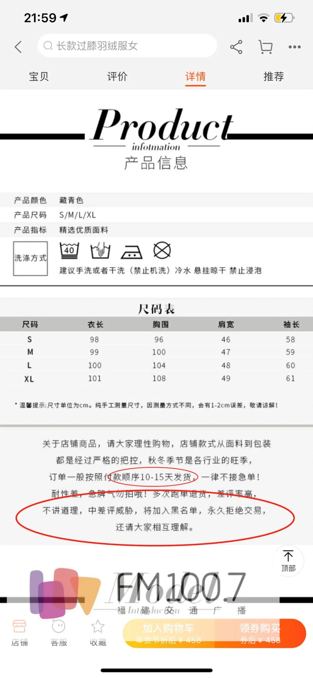 记者打开苏女士购买羽绒服的页面,在详情描述的最下方,有一行不明显的小字提醒,衣服会在拍下后10到15天内发货。