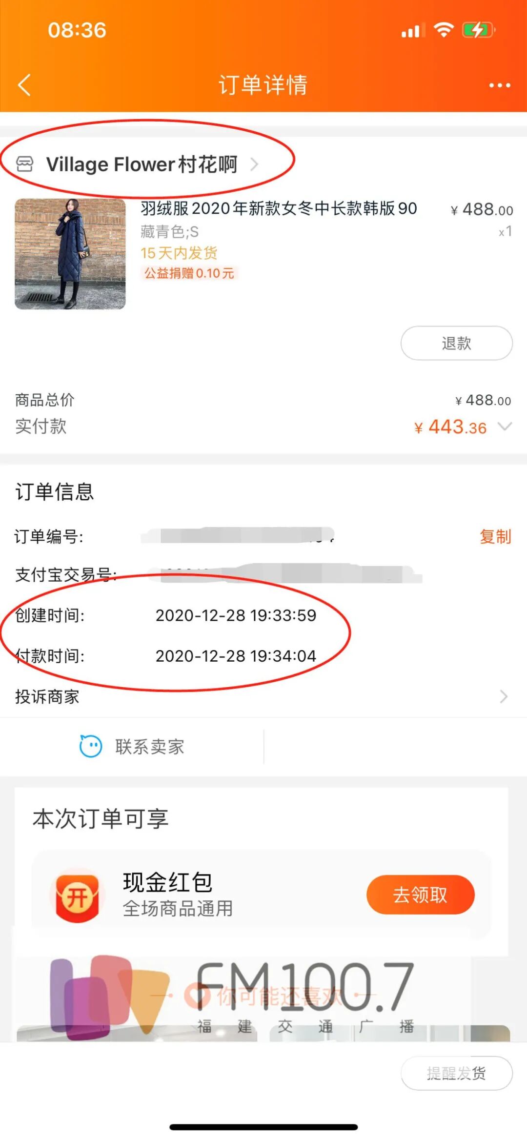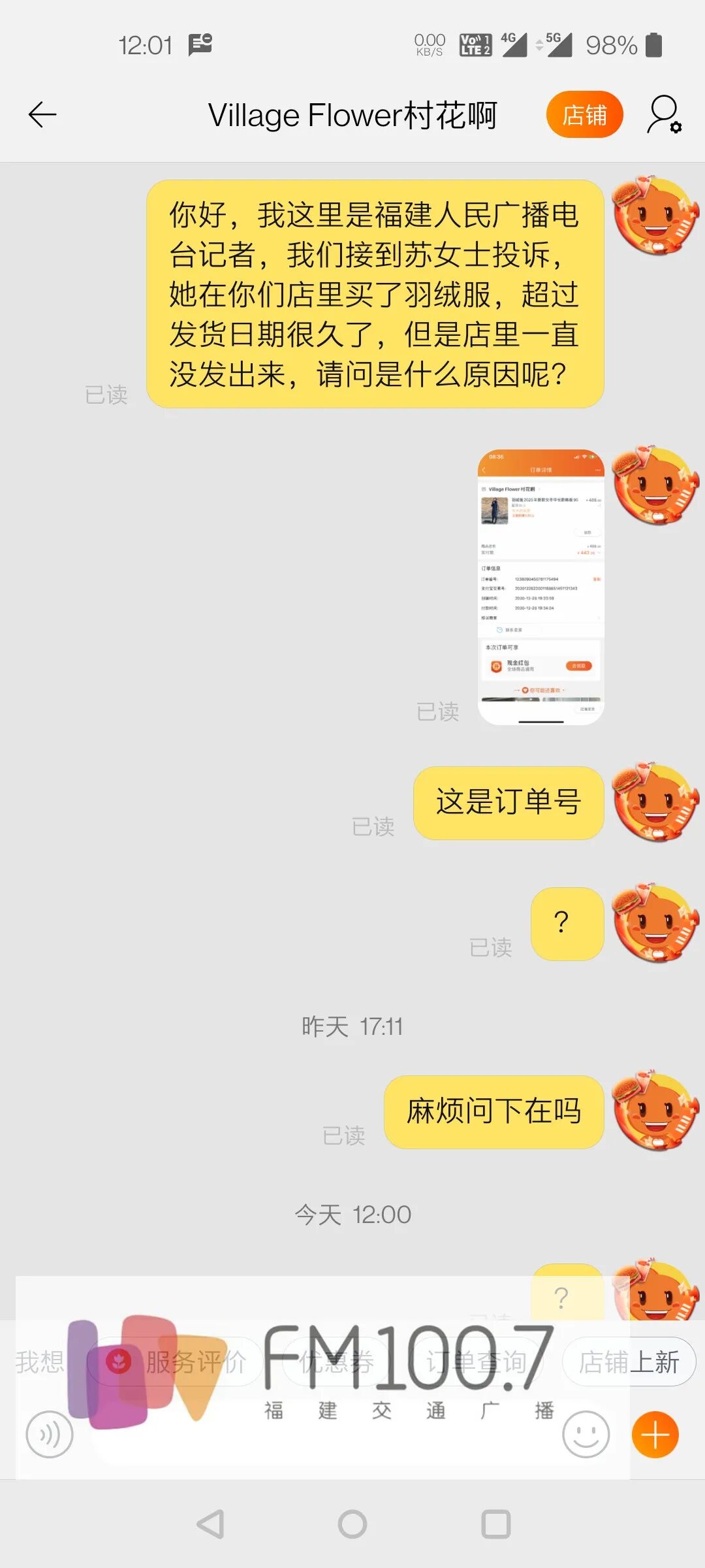 近日,1007接到福州车友苏女士的投诉,说自己年前在淘宝网一家名为Village Flower村花啊的服装店买了件羽绒服,结果一直不发货,多次和店方交涉,客服总是表示不知何时能发,自己又担心去其他地方买了,店铺又突然发货,所以很是苦恼。