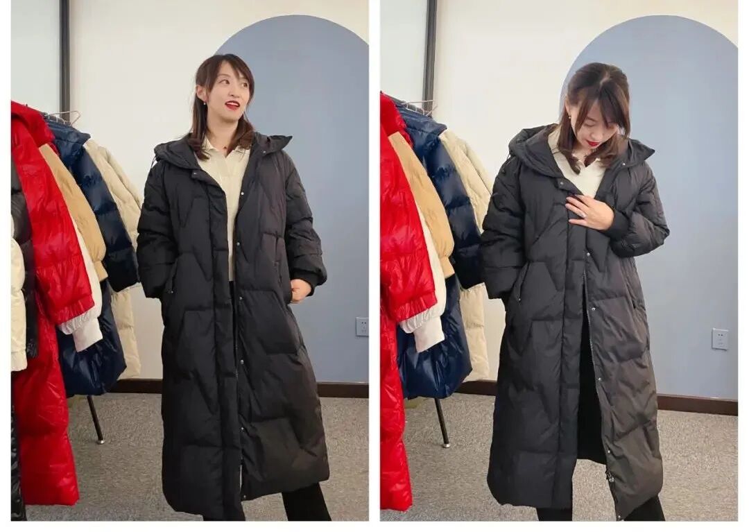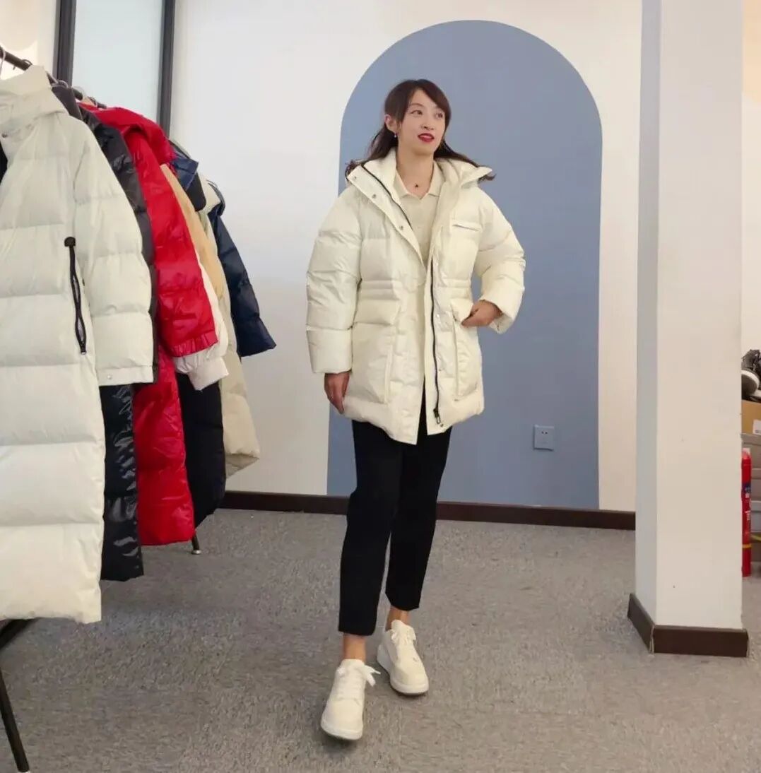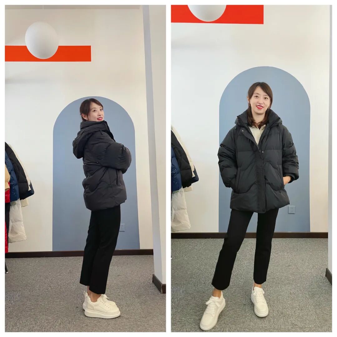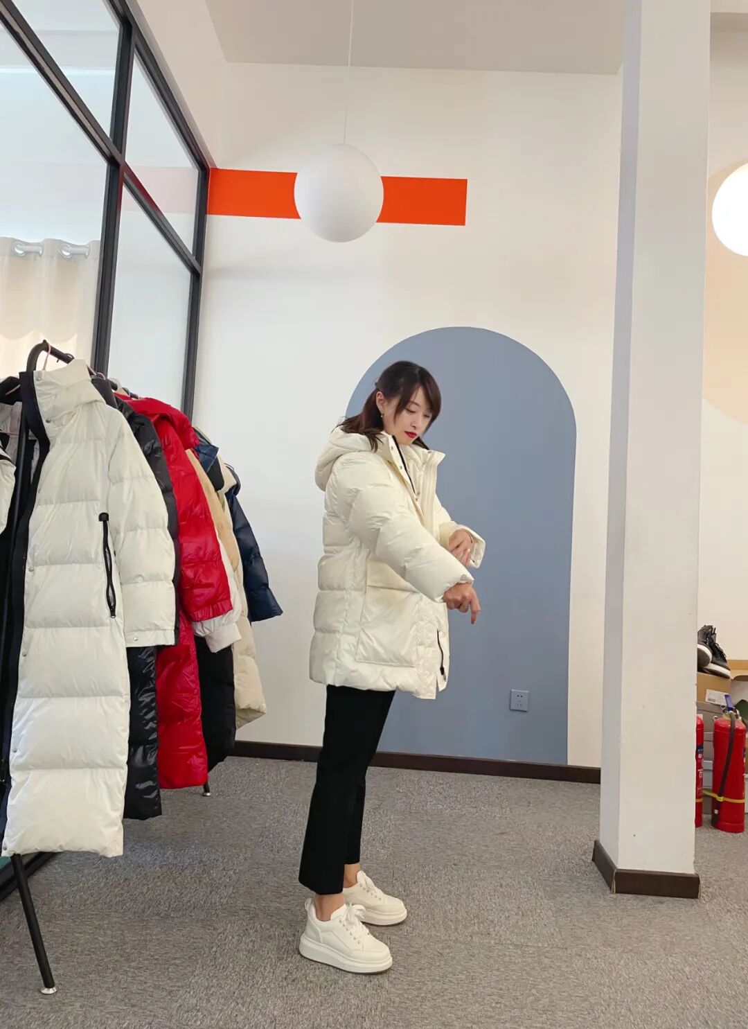 这一款是中长羽绒服的经典版型,如果特别长到脚踝会显矮,而且走路不方便,所以这个长度刚刚好,下摆有一点廓形,但腰部收腰,拉链拉上非常显瘦。