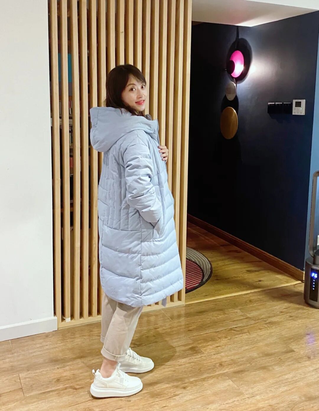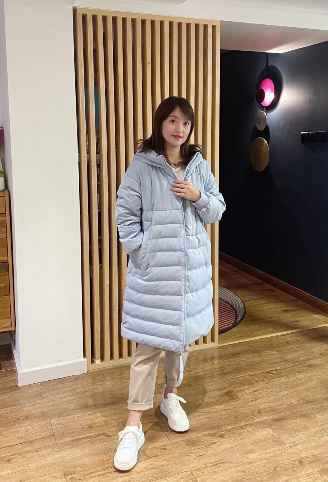这一款鹅绒羽绒服是H型版型的中长款,有一点廓形,但和A字还有一点区别,上半身不挑人,胖点瘦点穿起来都没有问题。