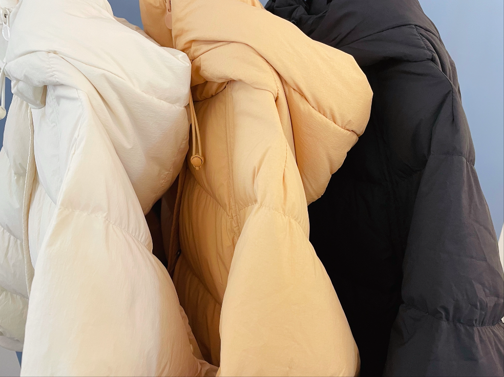 90白鸭绒的填充,重点是克重比其他款式都要多,所以保暖性相对更强,里面套一件羊绒衫就够,完全不用穿的很臃肿。