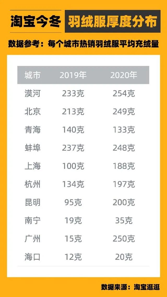 据淘宝逛逛调查,海口网友购买的羽绒服平均厚度为20克。