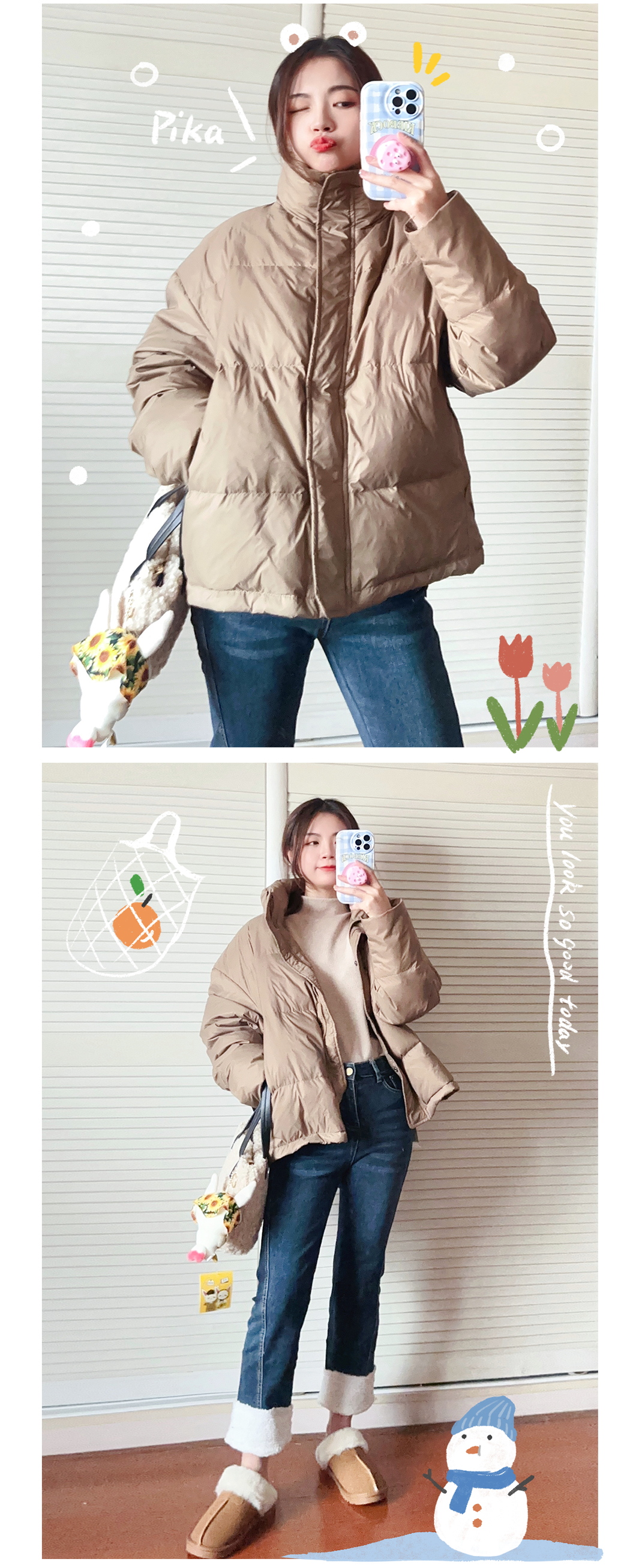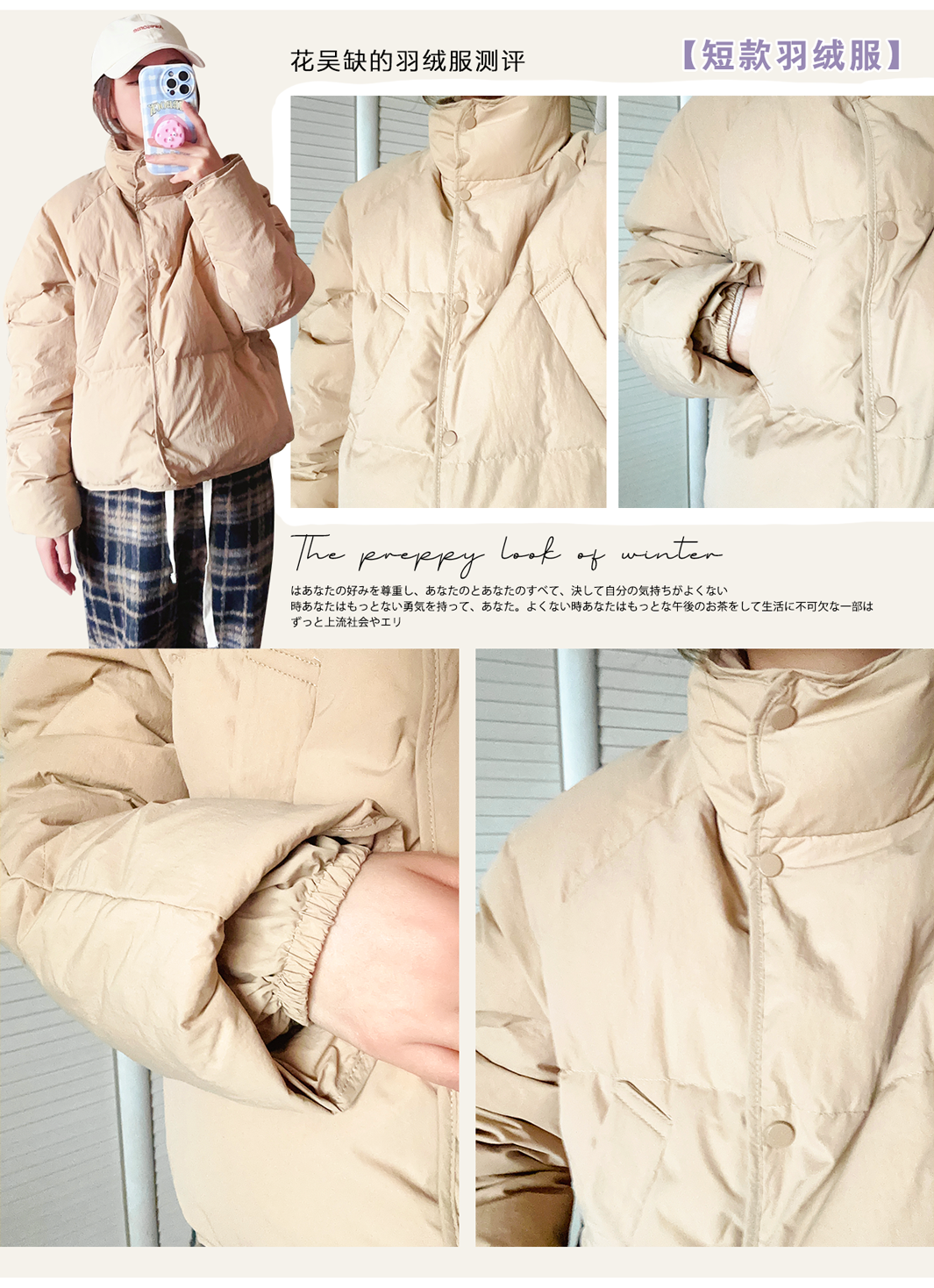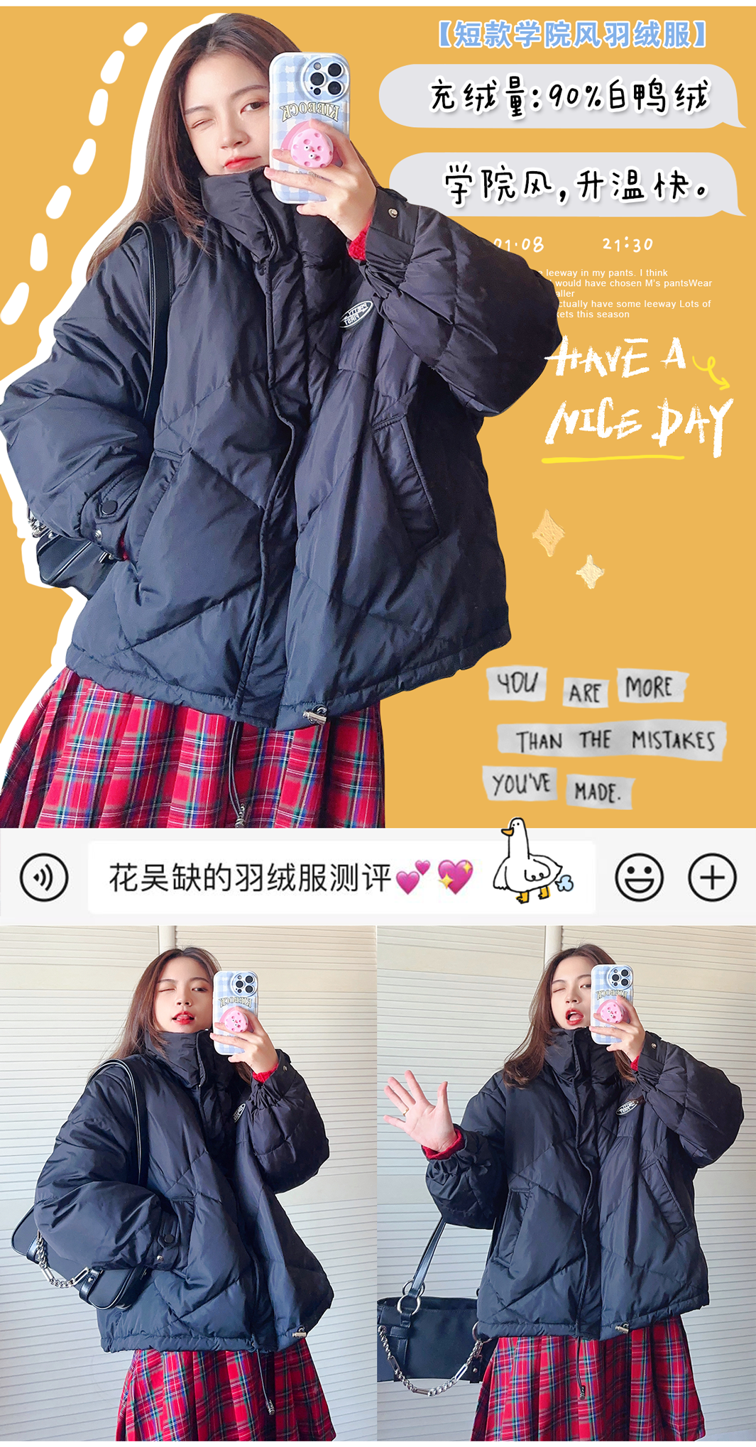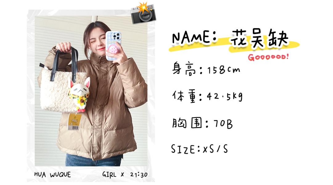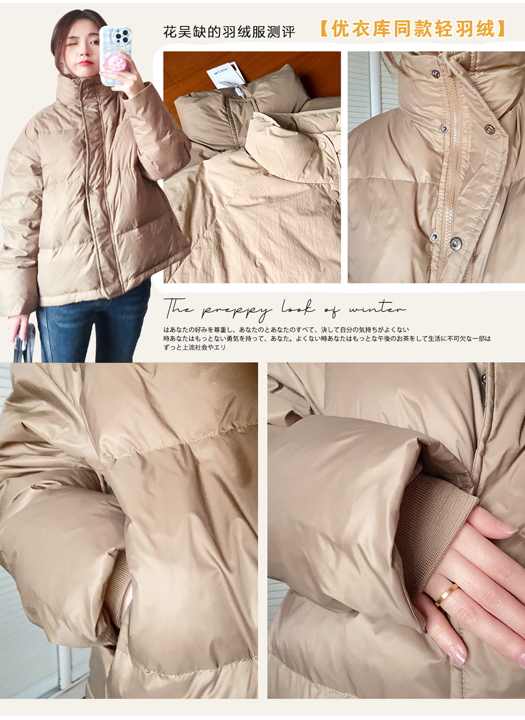 我发现这期所有的羽绒服都是90%的白鸭绒,但这并不是判断衣服厚薄的标准哈,而是羽绒在填充物里的占比,大家要知道噢~