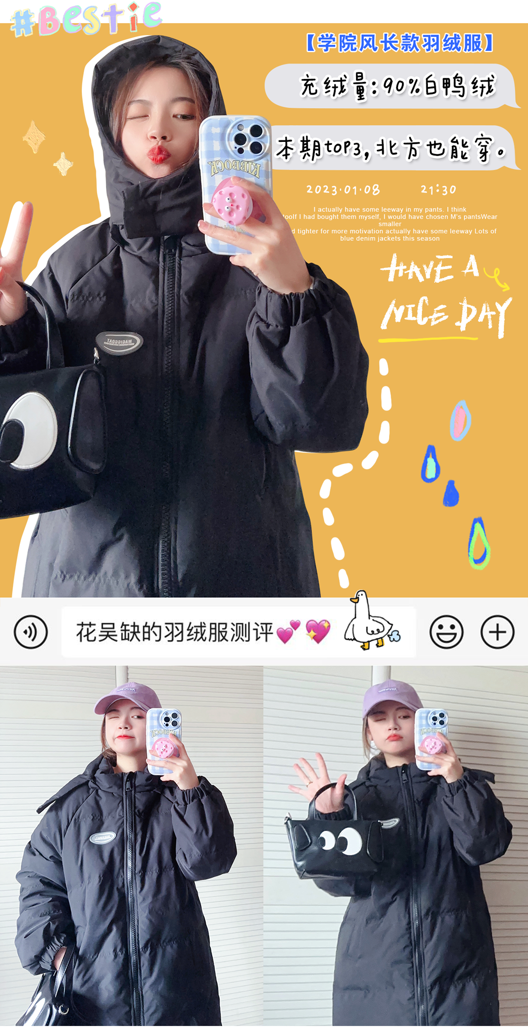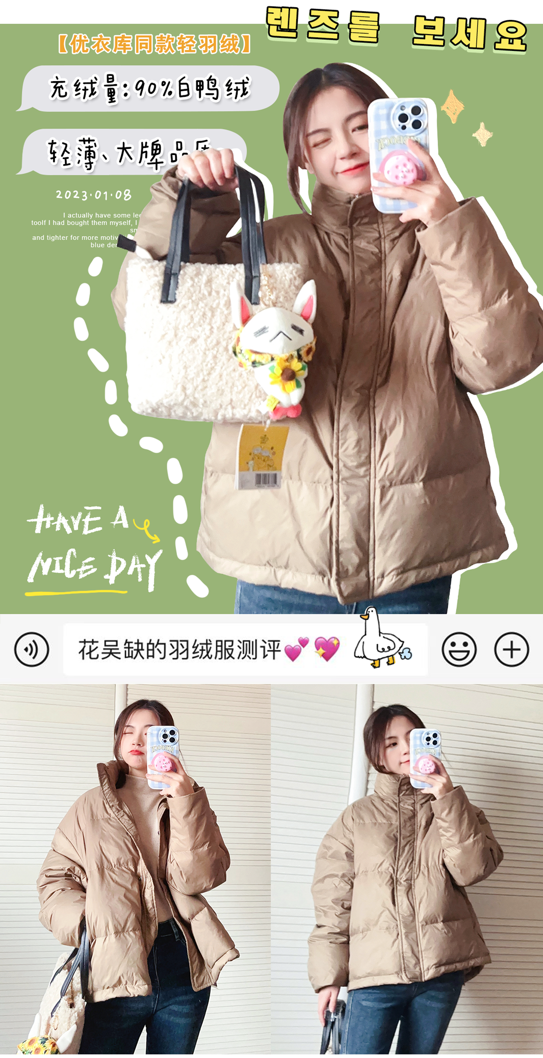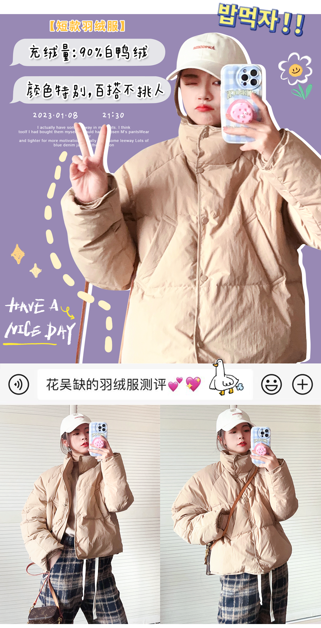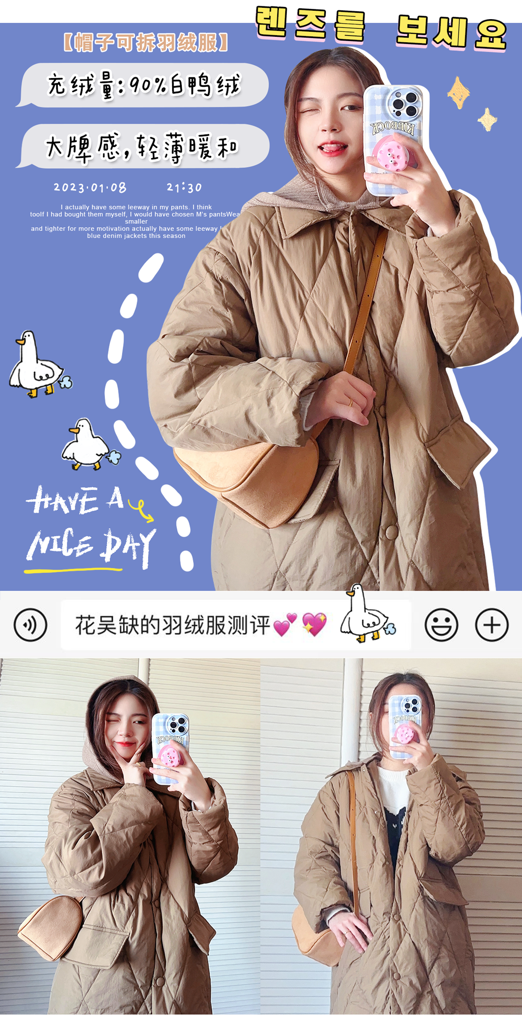 我发现这期所有的羽绒服都是90%的白鸭绒,但这并不是判断衣服厚薄的标准哈,而是羽绒在填充物里的占比,大家要知道噢~