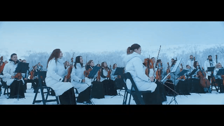 视频的主人公是一个国际乐团,他们在极寒温度下进行了一场极寒挑战,翻越高山,在雪峰上开起一场北极圈交响音乐会,演奏的还是一曲《冬天里的一把火》。