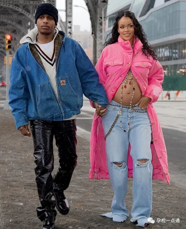 然而就在今年一月份,记者拍到和男友ASAP Rocky亲密出街的蕾哈娜,面对镜头,没有遮遮掩掩,坦然亮出隆起的腹部,上面戴着金色十字架和彩色珠宝项链,手拉着男友亲密出街。