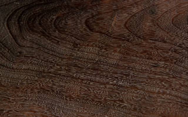 ② 白花崖豆木,即缅甸鸡翅木,产地在缅甸。心材黑褐或栗褐色,常带黑色条纹;管孔肉眼可见;密度大,沉于水;材质光滑细腻。树心有沙石心,即类似沙石一样的东西,并呈放射状的纹路由树心向外扩展。