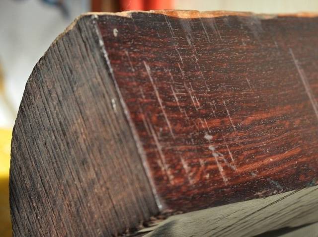 ④一般有油脂的酸枝木质量上乘,结构细密,性坚质重,可沉于水。特别明显之处是在深红色中还常常夹有深褐色或黑色的条纹,条纹即清晰又富有变化。