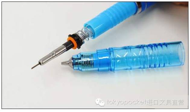 这种自动铅笔内部和一般自动铅笔不同,有两个弹簧,无论从任何角度施力,自动铅笔内部的弹簧与先端的金属部分都会保护笔芯。在写字的同时,内部构造就会开始运作。不过压超过四次的话还是有可能会断。