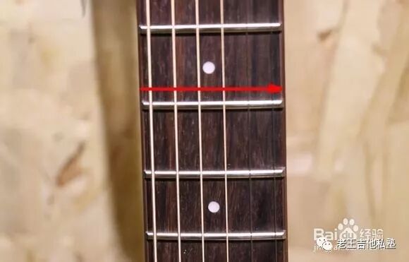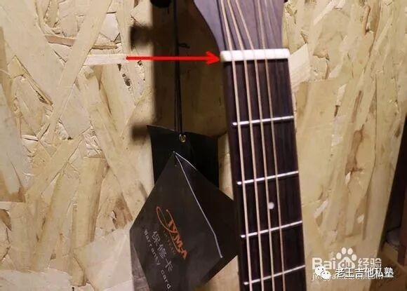 这个白色的条 就是弦枕了 准确的说 叫上弦枕(下弦枕一会儿说)也有可能是黑色的弦枕的材质常见的有塑料和牛骨它的作用是 固定并支撑琴弦 让弦和指板有一定的距离距离的高低决定了琴的手感 距离过高 弦距就大 按弦的时候很吃力 尤其对于初学者来说 大大增加了学琴的难度还记得前面我们说过的吗 一品琴弦到品柱的距离1mm是比较合适的~品丝问题再次简述一下 就是要:注意检查品丝的边缘 用手从琴头摸到琴颈交接出 看看有没有不平整的品丝 它可能会在今后练习的时候刮伤你的手指补充说一点 再检查一下品丝是不是平整 如果不平整 很容易造成打品(弹琴的时候琴弦震动和品柱产生兹兹的声音 就是常说的打品问题)顺着箭头的方向 看看品丝有没有左右不一样高的情况