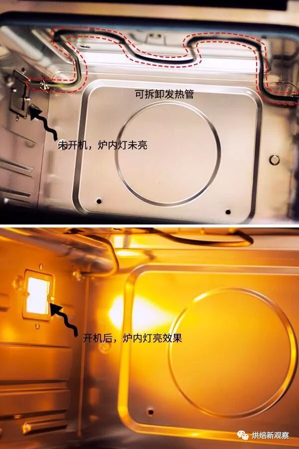 西屋蒸烤箱炉内上层是可拆卸的M型发热管,底部也有隐藏的发热管,使用的时候,一直有风声,是鼓风风扇在自动运转,让食物受热更均匀。开始,我一直没找到灯,打开电源才发现,是那个长方形的小块,挺亮的。