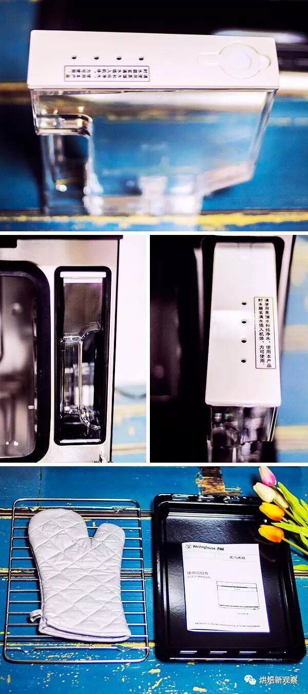 隐藏式水箱,蒸的功能必备的,使用过程中,发现蒸蛋之后,水箱里的水就少了。使用前必须装好水才行,不能忘记。配套的还有烤网架,烤盘,手套,说明书,说明书里包含菜单。