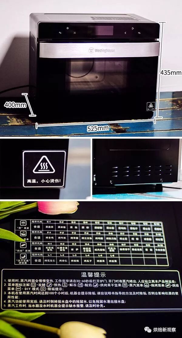 这台西屋蒸烤箱是30L的,525*400*435mm的体型,比较适合2-3人家庭使用。在蒸烤箱上明显的位置,都有标识,标明注意事项,以及做菜需要的程序,这样没有说明书的菜谱,自己也可以方便查询。很喜欢这个简约菜单的方式,非常人性化。毕竟一开始,那么多的功能,也记不住,临时翻菜谱,也会手忙脚乱的。