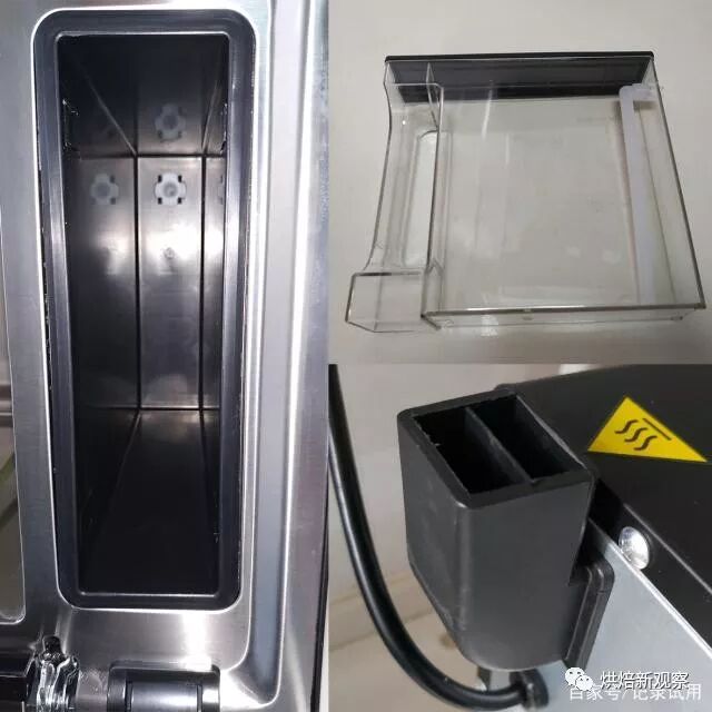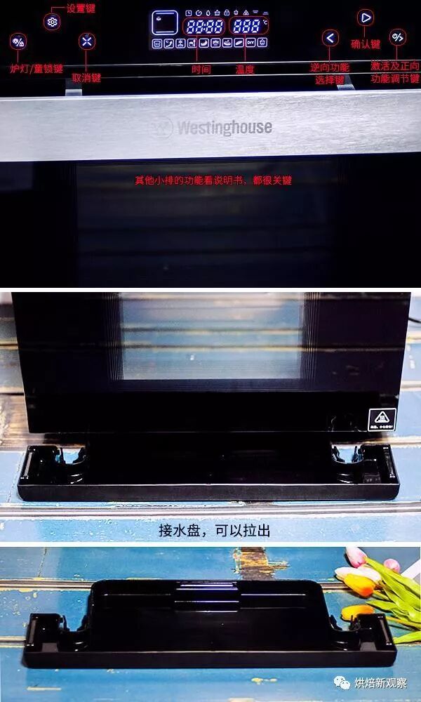 因为功能太多了,所以我只在图上标明了大图标的功能,具体的小图标,还是要多看说明书,说明书非常的重要,很详尽,很多重点的事项,都写明了,使用前,一定要仔细看!。然后因为是蒸烤箱,还放入水箱,所以会有很多水蒸气,然后凝结成水珠,所以配备了一个接水盘,用完拉出来,把水倒掉就好了,非常方便。