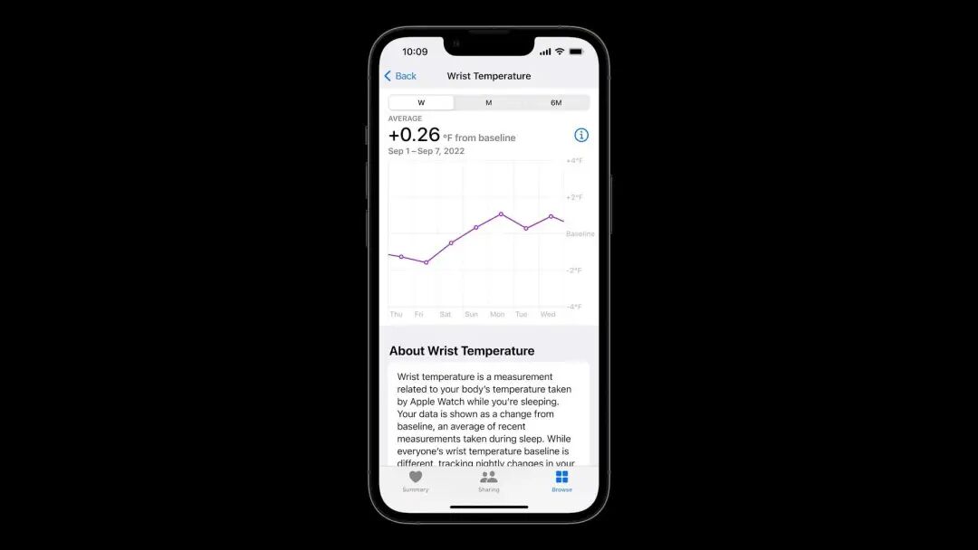跟测睡眠时的体温,呈现长期的体温变化情况。经期跟踪会使用这项数据回推估算可能的排卵日期,为生育计划提供参考。