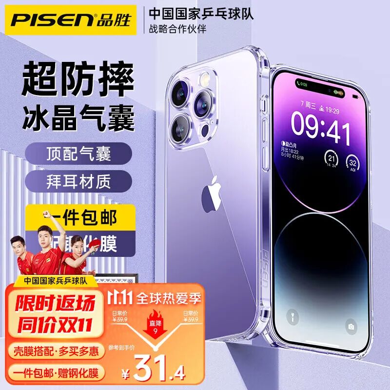 品胜【德国拜耳】苹果14手机壳iPhone14ProMax保护套14Plus透明气囊超薄防摔镜头全包 真·十米防摔丨冰晶超透丨配钢化膜 iPhone14Pro 6.1英寸