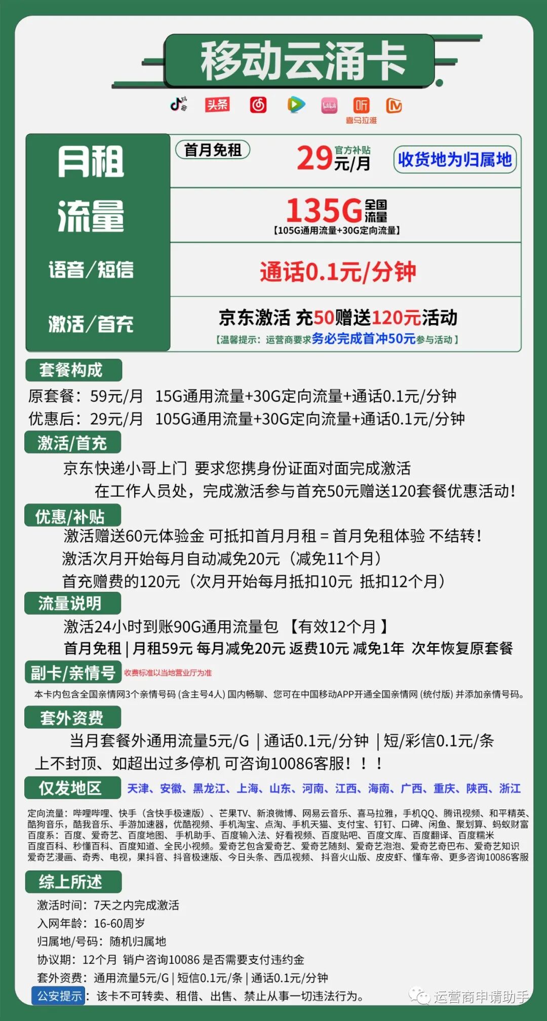 套餐:29元包105G通用+30G定向+通话0.1元/分钟