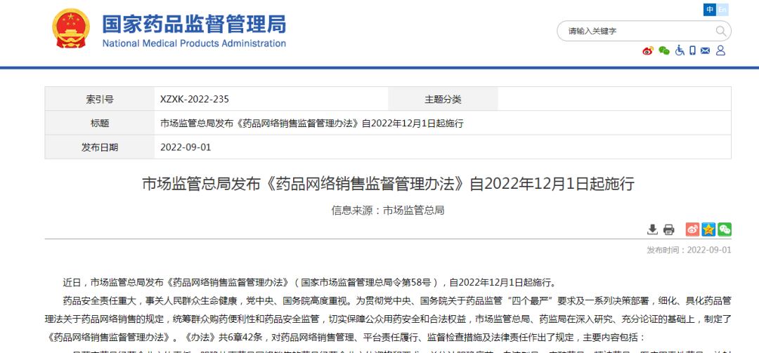 为规范药品网售,近期,国家市场监督管理总局发布了《药品网络销售监督管理办法》(以下简称《办法》),将于12月1日施行。